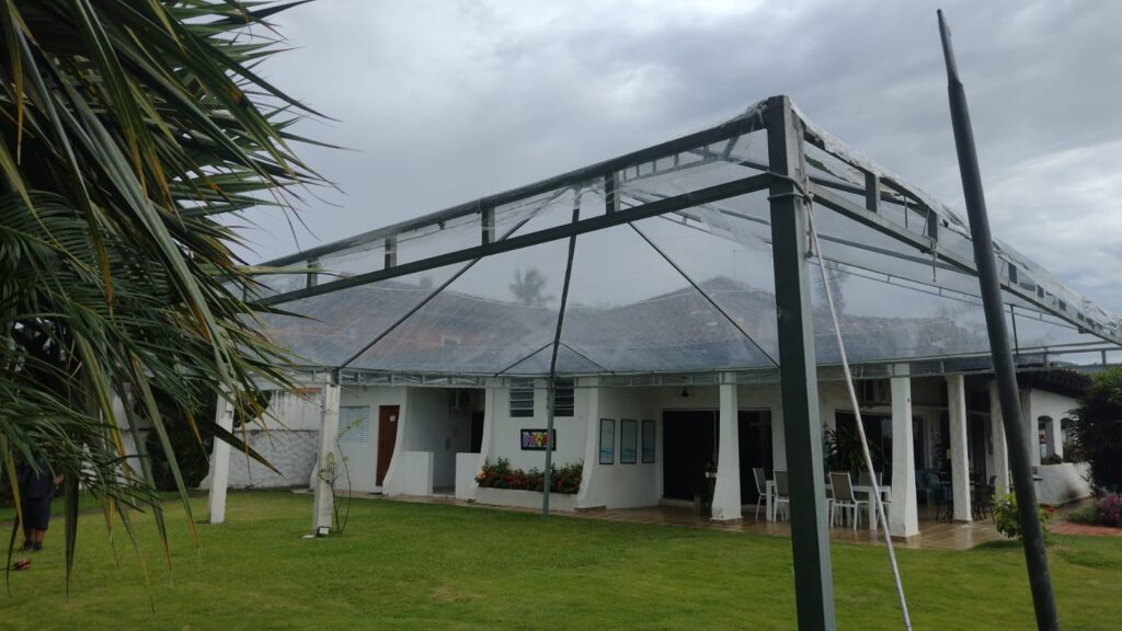 Tenda transparente que valoriza o ambiente e permite uma integração com o cenário.